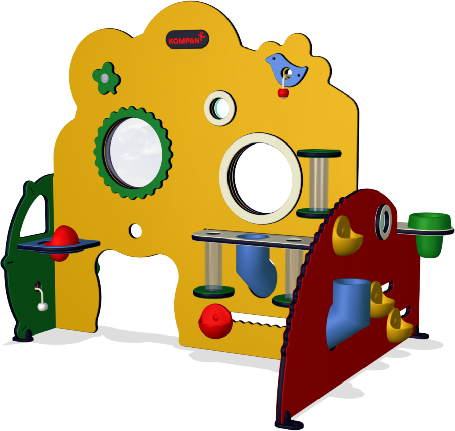 Budowla ta jest bodźcem i konstrukcją pod zabawę. Przyjazne kwiaty, koniczynki i ptaki dają odczucie przebywania w ekologicznej fabryki. Do zabawy w produkcję zachęcają niebieskie i przeźroczyste rury. Maluchy przepychają przez nie przedmioty z różnych materiałów i o różnych rozmiarach. Ruchome stoły po bokach dają dodatkowe możliwości napełniania i opróżniania. Konstrukcja zachęca do wielu zabaw takich jak "znajdź gwizdek", w których pomocne sąliczne szczeliny i otwory. Można zamówić książkę z opisem gier opracowaną i wydaną przez Instytut Gier KOMPAN.