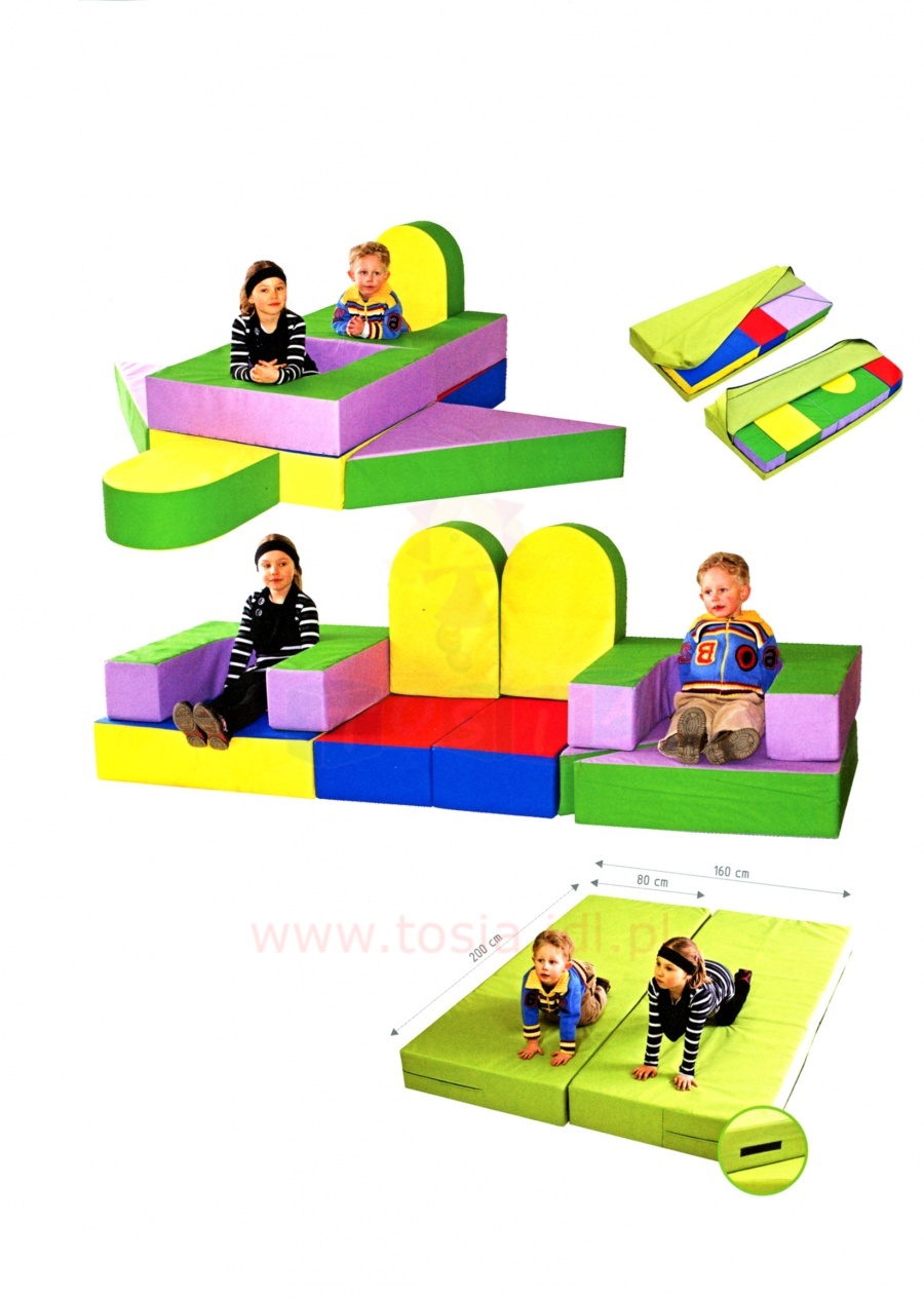 dwa duże materace. Rozmiar po złożeniu 200x1600x20 cm. Kształtki pokryte są kolorową,