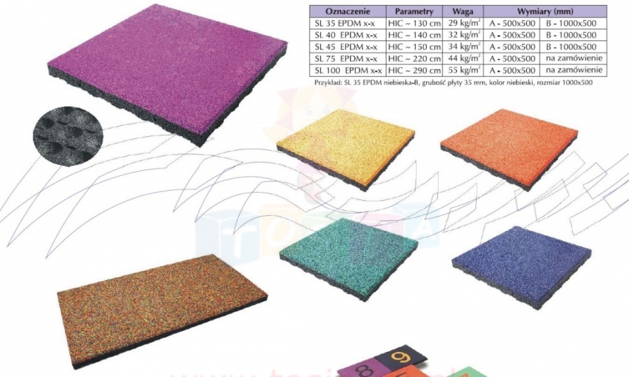 Płyty z powierzchnią EPDM to dwuwarstwowe płyty z widoczną zewnętrzną kolorową powierzchnią. Zaletą płyty SL EPDM jest to że przy prawidłowej konserwacji nie traci trwałości kolorów. Płyty te szczególnie polecane sa na place zabaw dla dzieci, gdzie ich kolory znacząco ożywiają powierzchnię do zabawy. Można je również stosować jako nawierzchnie sportowe, płyty do ogrodu czy otoczenia domów mieszkalnych. Płyty z powierzchnią EPDM posiadają wszystkie certyfikaty niezbędne do wykorzystania ich na placach zabaw dla dzieci i spełniają wymogi norm wymaganych w Unii Europejskiej.