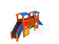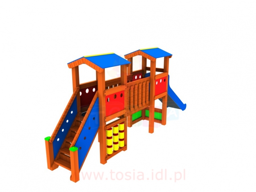 Wszystkie urządzenia wykonane są z drewna klejonego ; kantówki sosnowej, zabezpieczonej przed wpływem czynników atmosferycznych przez malowanie preparatem naturalnym. Elementy konstrukcyjne utwierdzone w gruncie za pomocą kotew stalowych przytwierdzonych do fundamentów punktowych. Zjeżdżalnie ze stali kwasoodpornej. Elementy meta-lowe ocynkowane. Liny atestowane o podwyższonej trwałości. Elementy pełne ; w tym daszki, bariery, osłony, zabezpieczenia zjeżdżalni i inne wykonane z płyty HDPE. Polietylen (HDPE) nie nasiąka wodą, nie pęcznieje, nie rozwarstwia się ani nie łamie. Jest to materiał odporny na trwałe zabrudzenia oraz graffiti. Posiada Atest PZH.