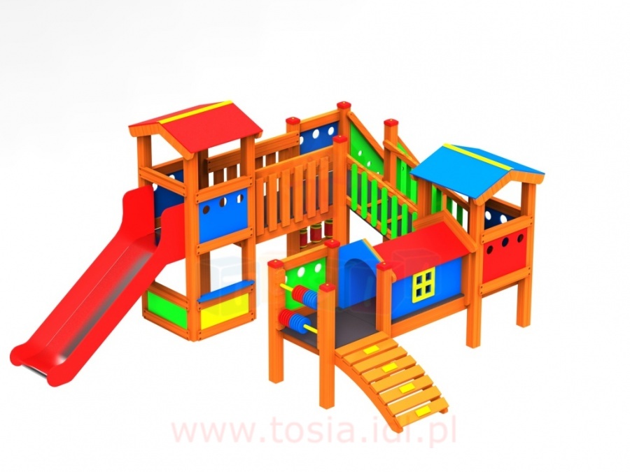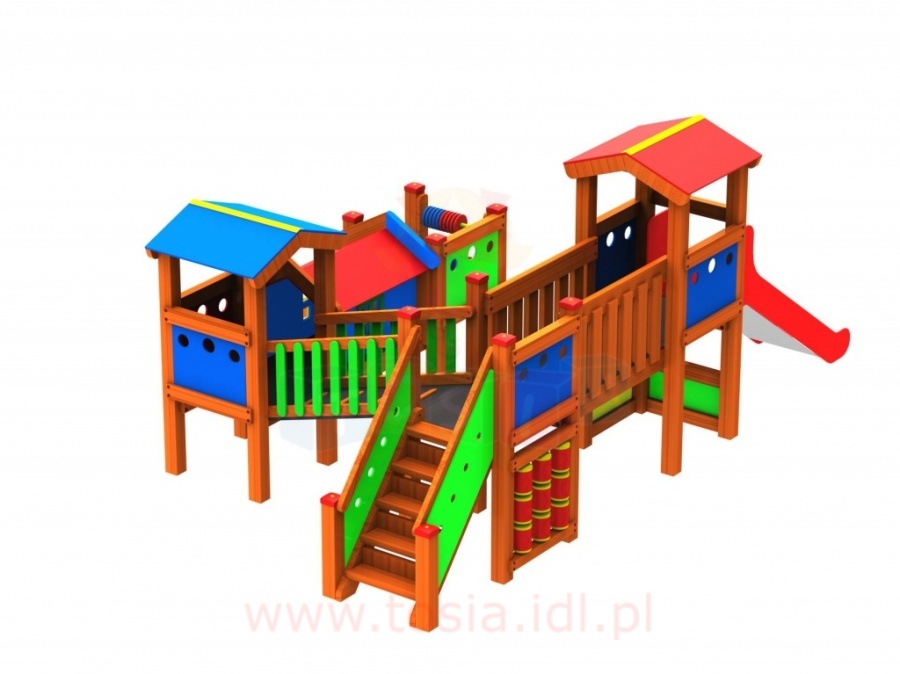 Wszystkie urządzenia wykonane są z drewna klejonego ; kantówki sosnowej, zabezpieczonej przed wpływem czynników atmosferycznych przez malowanie preparatem naturalnym. Elementy konstrukcyjne utwierdzone w gruncie za pomocą kotew stalowych przytwierdzonych do fundamentów punktowych. Zjeżdżalnie ze stali kwasoodpornej. Elementy meta-lowe ocynkowane. Liny atestowane o podwyższonej trwałości. Elementy pełne ; w tym daszki, bariery, osłony, zabezpieczenia zjeżdżalni i inne wykonane z płyty HDPE. Polietylen (HDPE) nie nasiąka wodą, nie pęcznieje, nie rozwarstwia się ani nie łamie. Jest to materiał odporny na trwałe zabrudzenia oraz graffiti. Posiada Atest PZH.