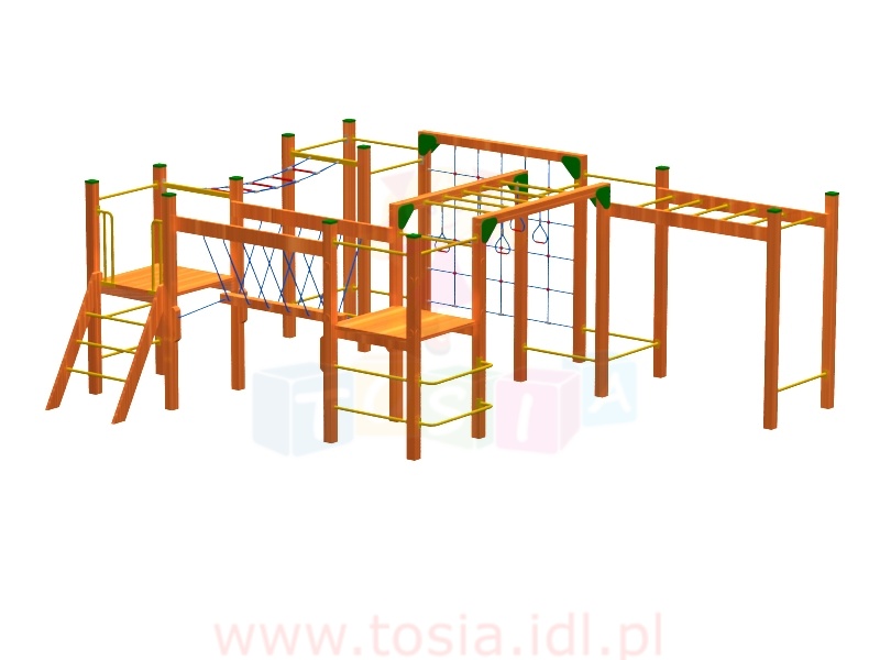 Wszystkie urządzenia wykonane są z drewna klejonego ; kantówki sosnowej, zabezpieczonej przed wpływem czynników atmosferycznych przez malowanie preparatem naturalnym. Elementy konstrukcyjne utwierdzone w gruncie za pomocą kotew stalowych przytwierdzonych do fundamentów punktowych. Zjeżdżalnie ze stali kwasoodpornej. Elementy meta-lowe ocynkowane. Liny atestowane o podwyższonej trwałości. Elementy pełne ; w tym daszki, bariery, osłony, zabezpieczenia zjeżdżalni i inne wykonane z płyty HDPE. Polietylen (HDPE) nie nasiąka wodą, nie pęcznieje, nie rozwarstwia się ani nie łamie. Jest to materiał odporny na trwałe zabrudzenia oraz graffiti. Posiada Atest PZH.