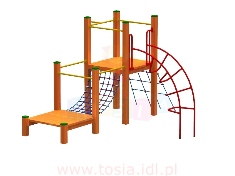 Wszystkie urządzenia wykonane są z drewna klejonego ; kantówki sosnowej, zabezpieczonej przed wpływem czynników atmosferycznych przez malowanie preparatem naturalnym. Elementy konstrukcyjne utwierdzone w gruncie za pomocą kotew stalowych przytwierdzonych do fundamentów punktowych. Zjeżdżalnie ze stali kwasoodpornej. Elementy meta-lowe ocynkowane. Liny atestowane o podwyższonej trwałości. Elementy pełne ; w tym daszki, bariery, osłony, zabezpieczenia zjeżdżalni i inne wykonane z płyty HDPE. Polietylen (HDPE) nie nasiąka wodą, nie pęcznieje, nie rozwarstwia się ani nie łamie. Jest to materiał odporny na trwałe zabrudzenia oraz graffiti. Posiada Atest PZH.